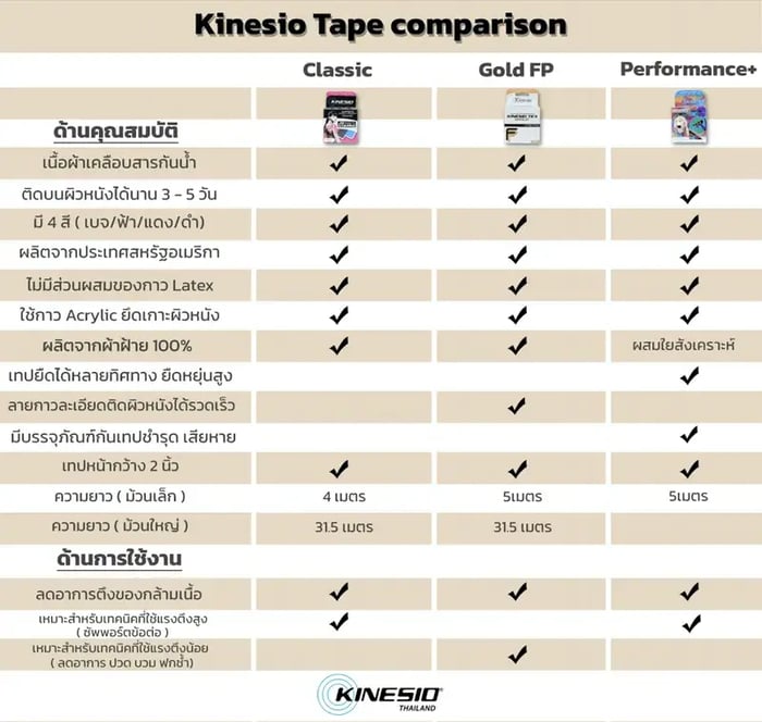 Kinesio Tape เป็นเทปพยุงกล้ามเนื้อ ที่ได้รับความนิยมมาก ในหมู่นักกีฬาและผู้ที่ต้องการฟื้นฟูอาการบาดเจ็บ แต่ละรุ่นมีคุณสมบัติและเหมาะกับการใช้งานที่แตกต่างกัน ดังนี้1. Classic